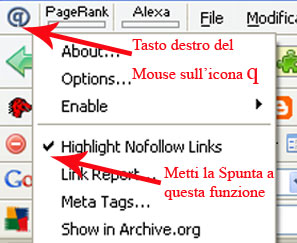 Passo 4: Clicca con il tasto destro del mouse sull’icona Q, si aprirà una finestra, nella quale sono presenti MOLTE funzioni utili; Spunta la funzione Highilight Nofollow Links per rendere operativa la funzione che a noi interessa, l’individuazione dei link Nofollow.