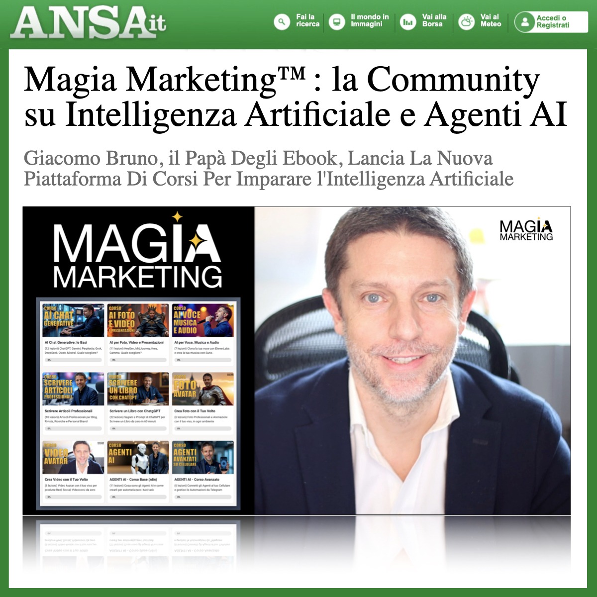 Se sei pronto a fare il prossimo passo e vuoi imparare a sfruttare l’AI per il tuo lavoro o per la tua attività, Magia Marketing™ è la community che fa per te. Non solo avrai accesso a corsi completi e a un supporto continuo, ma entrerai a far parte di un gruppo di professionisti che, come te, sono pronti a sfruttare il potere dell’Intelligenza Artificiale per raggiungere il successo.